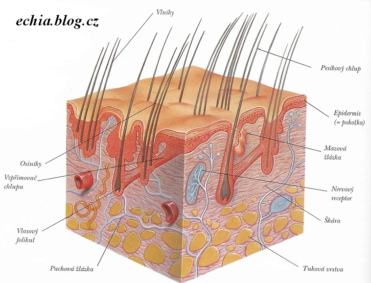 – obsahuje vlasové folikuly, mazové a potné žľazy, nervové zakončenia a cievy. -